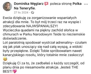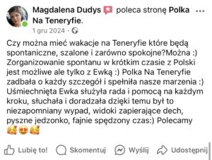 "Ewa es una mega mujer❤️ me ayudó a organizar una sorpresa para mi prometido que resultó increíble 🤩😍 si volvemos a Tenerife, lo primero que definitivamente haremos será contactar nuevamente con Ewa ❤️."
